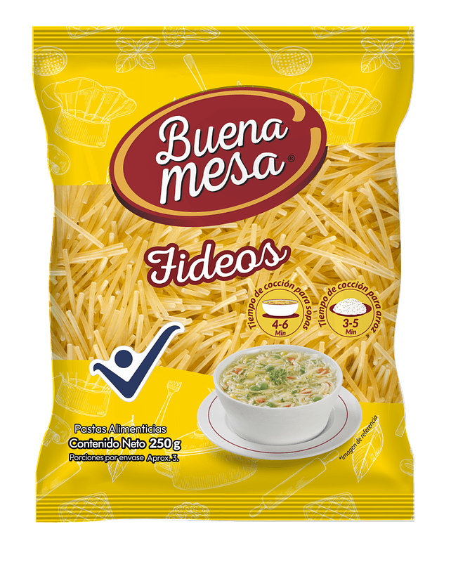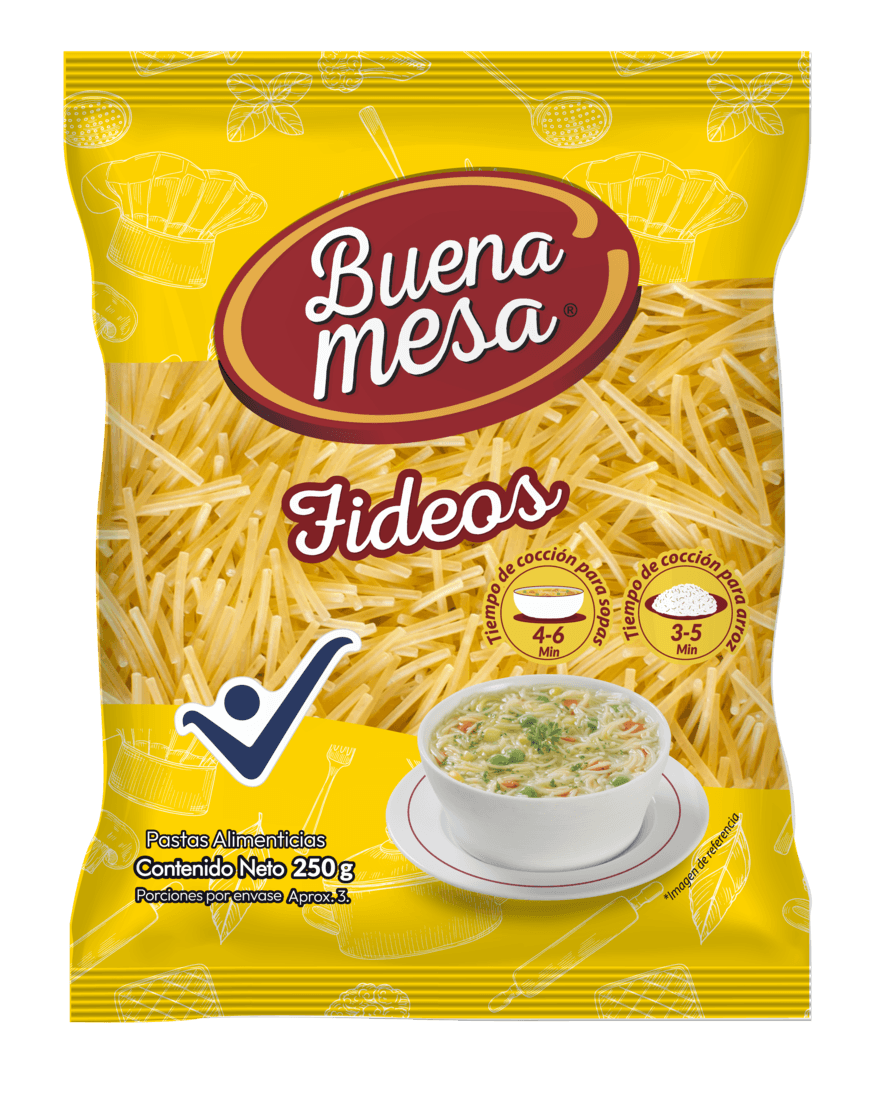Fideos buena mesa en presentación de 250g. Rinde más para toda la familia.